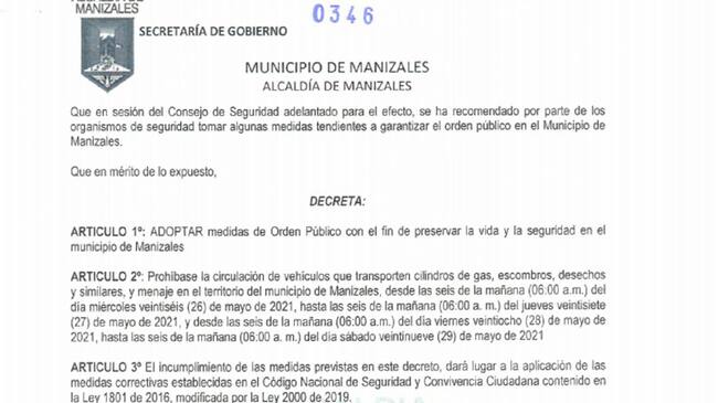 Con motivo de las movilizaciones que se realizarán esta semana en varios sectores de la ciudad, la Alcaldía de Manizales ha comunicado que se prohibe la circulación de vehículos que transporten cilindros de gas, escombros, desechos y similares, además de elementos de menaje como muebles, ropa y enseres; desde el miércoles 26 de mayo a las 6 de la mañana hasta la misma hora del jueves 27.