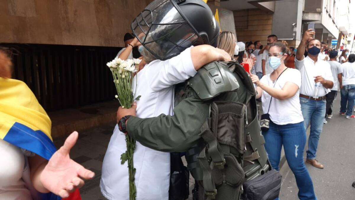 Varios de los marchantes entregaron flores y abrazos a los miembros de la Policía