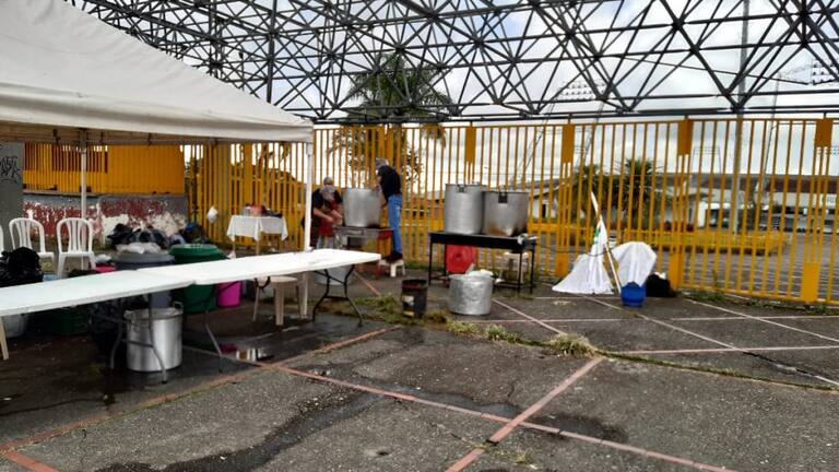 Al fondo las ollas donde se preparó el sancocho comunitario en inmediaciones del estadio Centenario