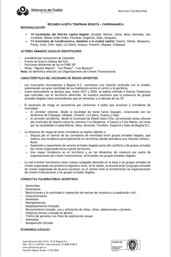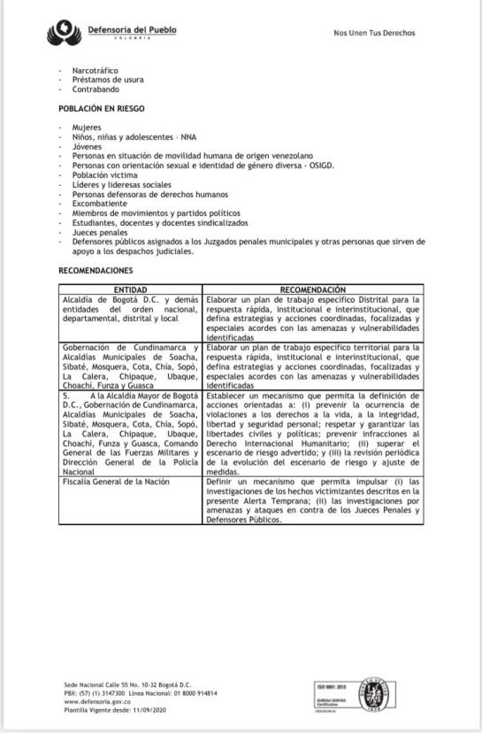 La Defensoría recomendó a la Alcaldía de Bogotá y demás entidades del orden nacional, departamental, distrital y local elaborar un plan de trabajo específico Distrital para la respuesta rápida, institucional e interinstitucional, que defina estrategias y acciones coordinadas, focalizadas y especiales acordes con las amenazas y vulnerabilidades identificadas.