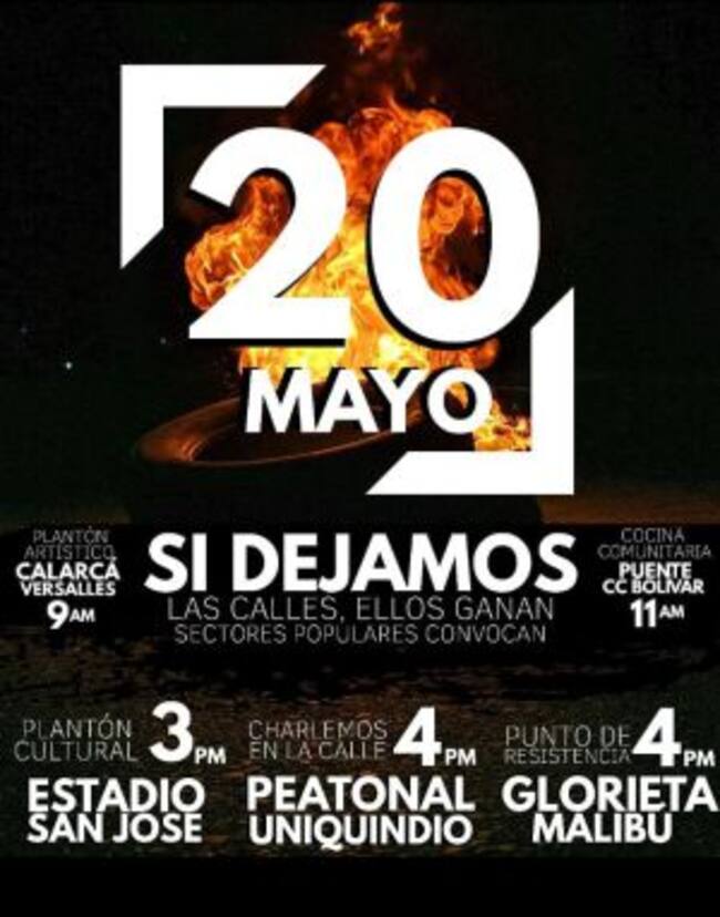 De otro lado los jóvenes y estudiantes universitarios han programado una marcha de antorchas por los muertos y desaparecidos en otras regiones del país en medio del paro nacional, la actividad está programada desde el CAI del parque fundadores al norte de la capital del Quindío desde las 4 de la tarde.