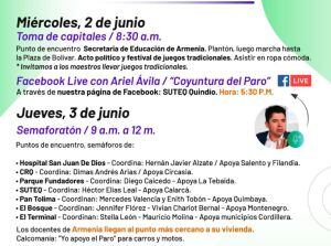 Hoy día de una nueva jornada de movilizaciones en Armenia con motivo del paro nacional, los maestros se concentrarán en la sede de la secretaria de educación sobre las 8:30 de la mañana y saldrán en marcha hacía la plaza de Bolívar donde tendrá un acto político y de juegos tradicionales.