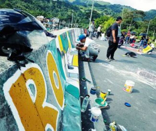 El Colectivo Pintor del paro nacional en los puentes de la avenida Bolívar en Armenia