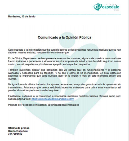 El concejal de Manizales, Christian Pérez Holguín, le dijo a Caracol Radio que es preocupante la situación que se vive actualmente en la Clínica Ospedale, que antiguamente se conocía como Versalles, ya que muchos profesionales de la entidad están renunciando de manera masiva.