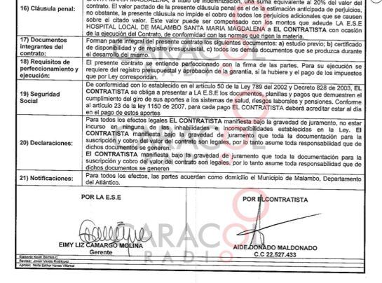 La exgerente que firma el contrato en mención, Eimy Liz Camargo Molina, fue retirada recientemente de su cargo por parte de la alcaldía de Malambo con una carta protocolaria que según denunció en su momento la firmó bajo presión del alcalde.