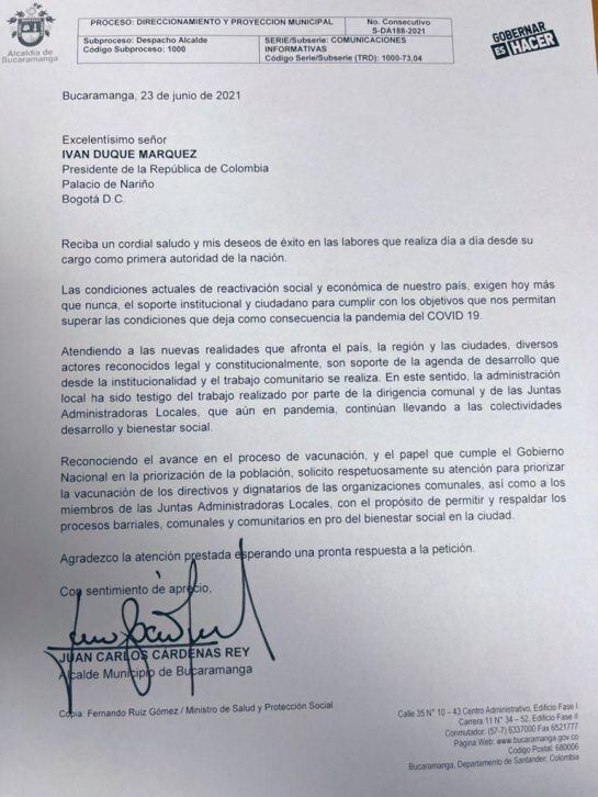 El alcalde de Bucaramanga, Juan Carlos Cárdenas, solicitó al Presidente de la República, Iván Duque, y al ministro de salud, Fernando Ruíz, incluir en el plan de vacunación a los miembros de juntas de acción comunal y ediles que aún no tienen la edad priorizada en las etapas que se están ejecutando.