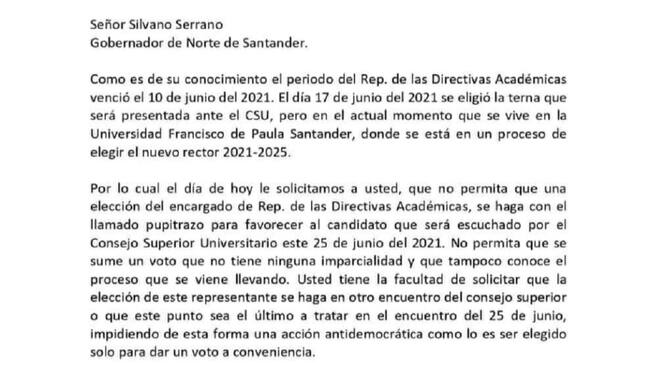 Los estudiantes en la ciudad de Cúcuta qué pertenecen a Universidad Francisco de Paula Santander emitieron un documento en donde le pidieron al gobernador de Norte de Santander no permitir la elección del encargado del representante de las directivas académicas.