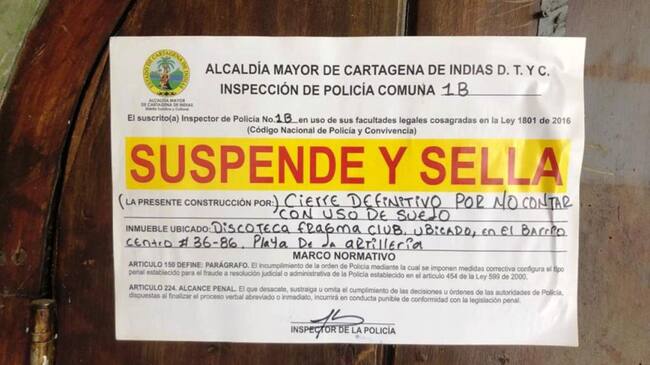 La Inspección de Policía de la Unidad Comunera No 1B impuso medida correctiva, consistente en cierre definitivo, al establecimiento de comercio de razón social Fragma Club, por no cumplir con el lleno de los requisitos exigidos para realizar de manera legal su actividad, debido a que no tenía el documento de uso del suelo, requisito indispensable para su funcionamiento.