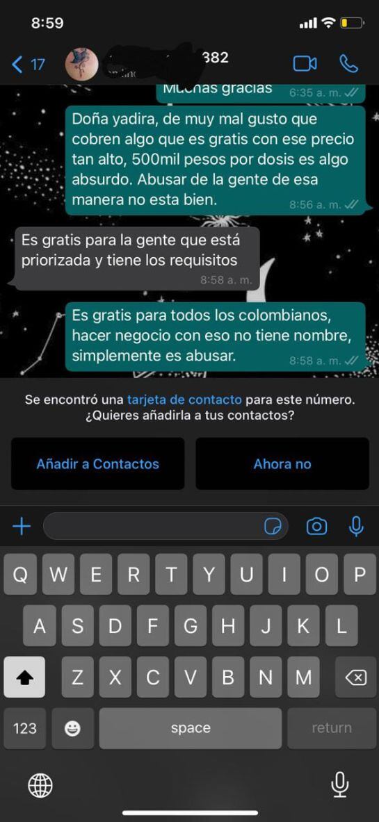 “La persona se sube al carro, tiene ropa particular y tiene acceso al sistema y a las vacunas. Antes de vacunar pregunta por la plata porque nos dijo que cada dosis valía 500.000 pesos. Ese día tenía como cuatro carros más, entonces iba con ellos, daba la vuelta y volvía por nosotros, pero al saber que cobraban todo eso dijimos que no, no nos pareció que hicieran negocio”, dijo la persona que elevó la denuncia ante las autoridades competentes en Floridablanca.