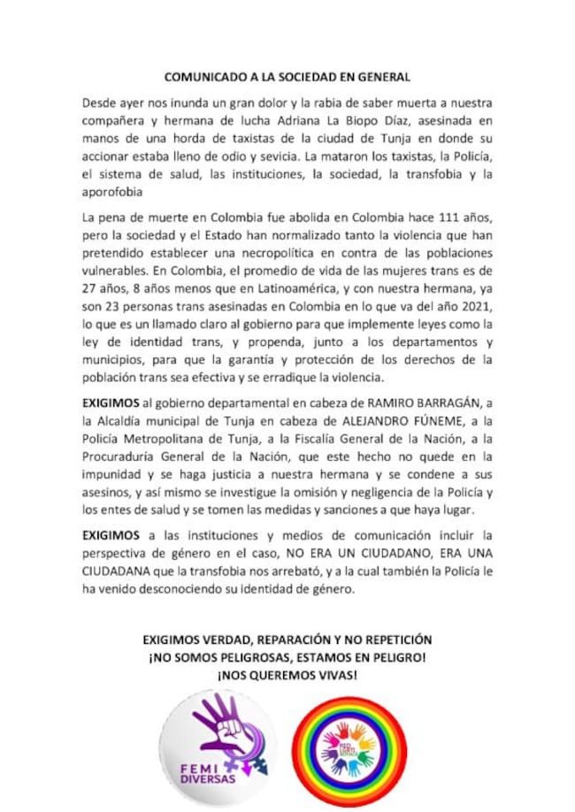 “A raíz del asesinato de una mujer trans trabajadora sexual el día lunes en la ciudad de Tunja (Boyacá) en manos de una horda de taxistas llenos de odio y sevicia, EXIGIMOS justicia por nuestra compañera y hermana de lucha”, sostuvo en Caracol Radio Andra, la representante de la Red LGBTIQ+, integrante de Femidiversas de Boyacá y de la fundación de diversidad y genero CATT.