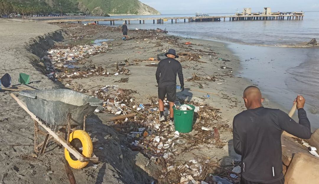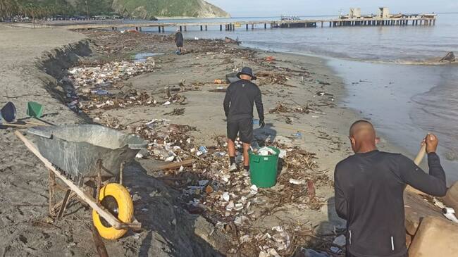 Un grupo de tripulantes de la Estación de Guardacostas de Santa Marta realizaron la jornada de limpieza en las playas, sobre todo en sectores del rio Manzanares, área que producto de las fuertes lluvias y la creciente del rio, recibió los desechos que llegaron a la desembocadura que conecta con la bahía de la capital del Magdalena, contaminando el entorno de estos balnearios.