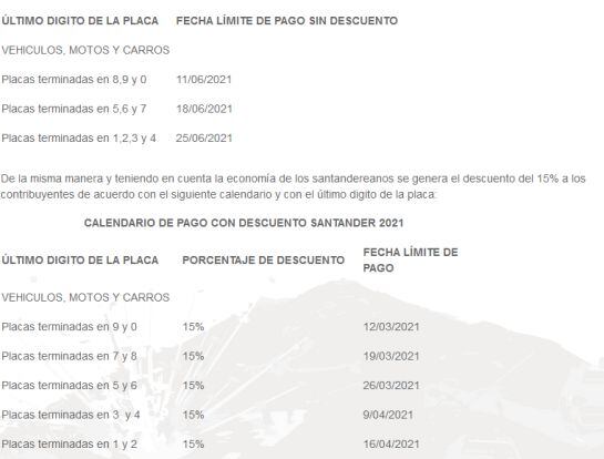 En la página web de la gobernación de Santander apareció explicado el cobro del impuesto vehicular con las fechas de los vencimientos el domingo 10 de enero. En el boletín de prensa se explicaba que había dos tipos de plazos, con y sin descuentos.