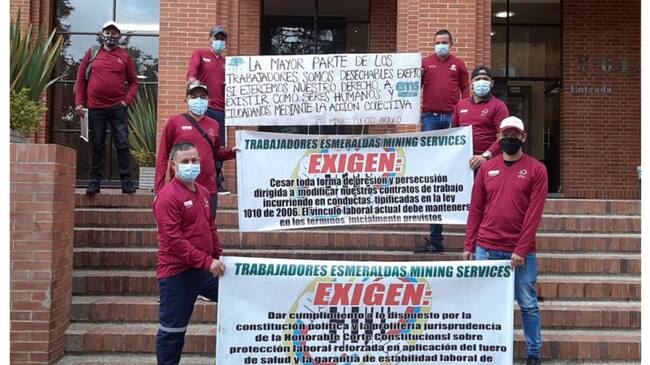 Alrededor de 10 trabajadores de Muzo, decidieron desplazarse hasta la capital del país para realizar un plantón frente a las instalaciones de la empresa Esmeraldas Mining Services, tras su inconformidad con la mesa de diálogo virtual que se adelantó con representantes de la entidad y delegados de la gobernación de Boyacá; acción que se tomó tras 7 días de protestas en ese municipio.