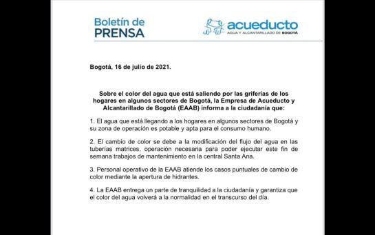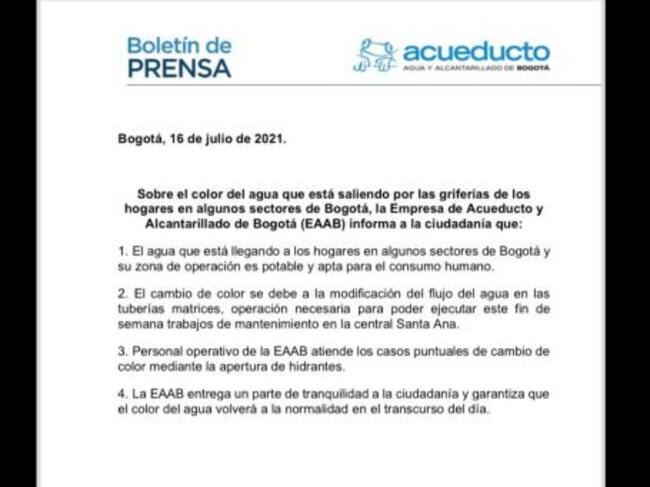 El Acueducto respondió sobre esta situación y mediante un comunicado indicaron que el agua que está llegando a los hogares en algunos sectores de Bogotá y su zona de operación es potable y apta para el consumo humano, además el cambio de color se debe a la modificación del flujo del agua en las tuberías matrices, operación necesaria para poder ejecutar este fin de semana trabajos de mantenimiento en la central Santa Ana.