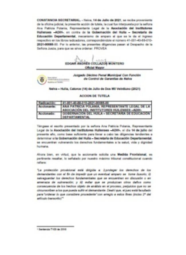 "La orden de retorno a la presencialidad genera un perjuicio irremediable sobre las garantías fundamentales a la vida, la salud, la integridad física y la dignidad humana no solo de los miembros de la Asociación del Institutores Huilenses –ADIH-, sino de la comunidad educativa en general, por cuanto es un hecho notorio el incrementos de contagios en el departamento del Huila, así como también que la ocupación de camas UCI en la ciudad de Neiva con un porcentaje superior al 90% en la ciudad de Neiva por lo que resulta ineludible emitir una orden a efectos de evitar vulneración de los derechos fundamentales" describe el documento.