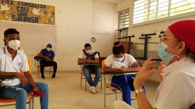 La secretaria de Educación, Olga Acosta Amel, se reunió con un grupo de estudiantes de la Institución Educativa de Bayunca en zona rural de Cartagena, liderados por su personero, para escuchar sus inquietudes sobre las inversiones que demanda la escuela para mejorar la infraestructura educativa.