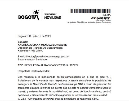Las autoridades de Bucaramanga pidieron en su momento "100 equipos de control local de semáforos de referencia C800 y uno de control central de semáforos de referencia SICOMP M56 con sus elementos, partes, accesorios y materiales complementarios" bajo la figura de enajenación de bienes muebles a título gratuito entre Entidades Estatales.