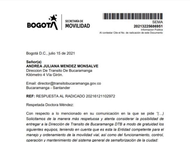 "Según revisión de su inventario, se estima que podría entregar entre 30 y 40 controladores de la serie C800 mediante la figura jurídica antes referida y según el procedimiento establecido por la Dirección Administrativa y Financiera de la entidad", advierte la secretaría de Movilidad de Bogotá.