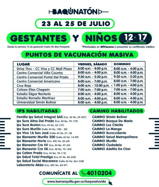 Puntos de vacunación para gestantes y menores de 12 a 17 años con comorbilidades / Alcaldía de Barranquilla