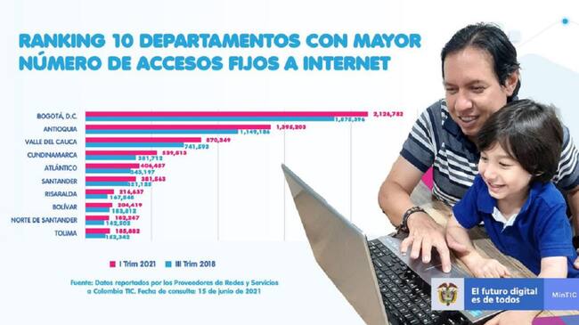 Indicó que "estos resultados ratifican que Colombia, en los primeros tres meses del año, continuó aumentando en penetración de Internet fijo al subir de 7,78 millones de accesos al cerrar 2020 a 8,05 millones al finalizar marzo de 2021”.