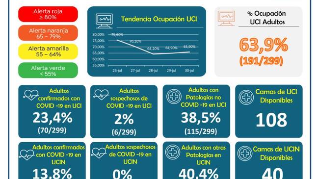 Actualmente en Caldas se tiene una ocupación de UCI para adultos del 65,9%, por lo que se tiene la alerta naranja, pues de las 299 camas de este tipo instaladas, 191 están actualmente ocupadas.
