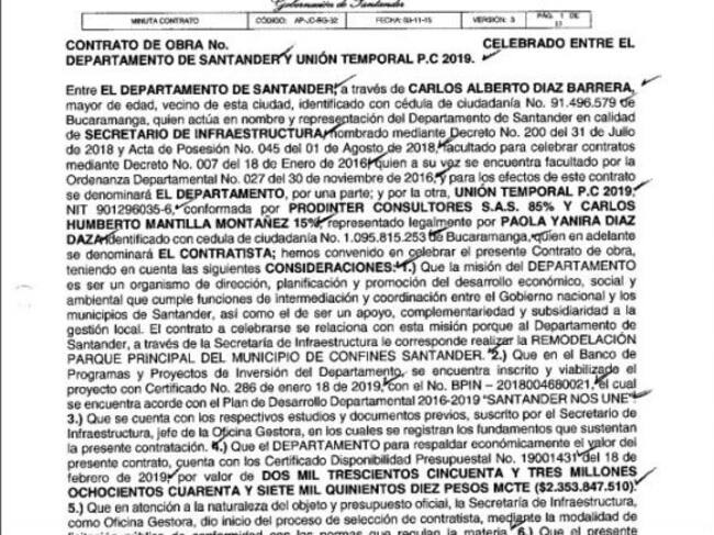 Las obras fueron contratadas durante la administración del exgobernador de Santander, Didier Tavera Amado por un valor de $2353 millones con una firma llamada Unión Temporal P.C 2019, conformada por Prodinter Consultores S.A.S y Carlos Humberto Mantilla Montañez.