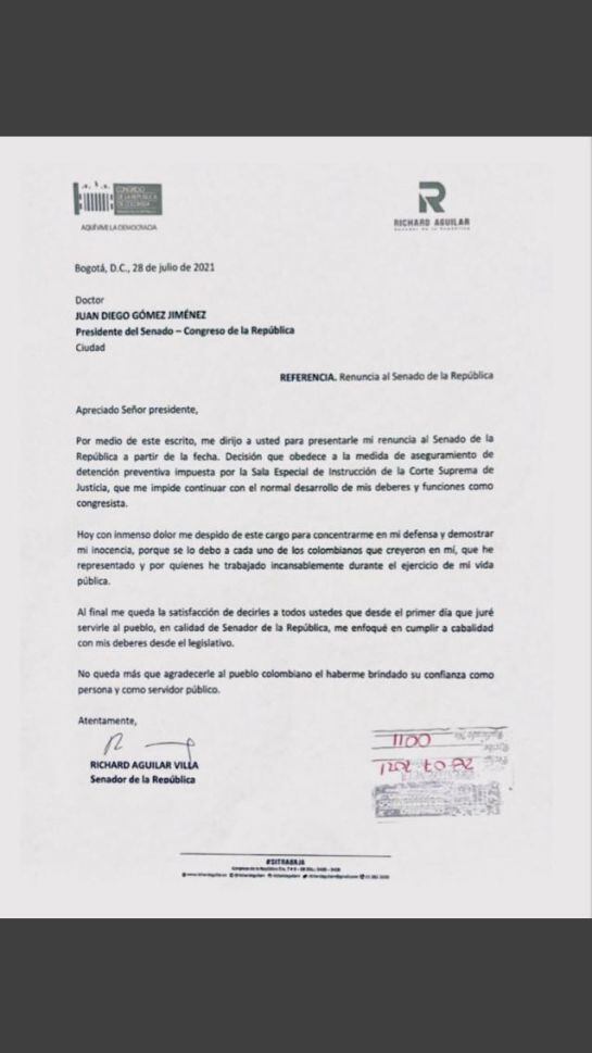 El senador Richard Aguilar presentó en horas de la tarde de hoy, 28 de julio, la renuncia a su curul en el Senado para concentrarse en su defensa.