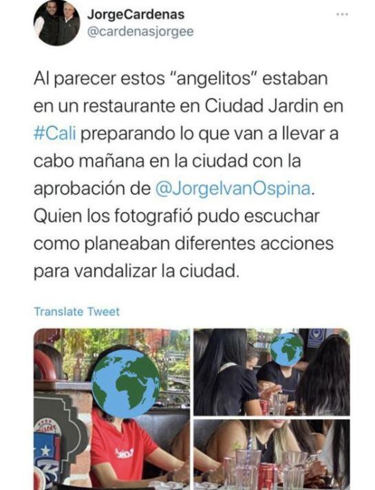 El trino de Jorge Cárdenas decía lo siguiente : “ Al parecer estos ‘Angelitos’ estaban en un restaurante de Ciudad Jardín en #Cali preparando lo que van a llevar a cabo mañana en la ciudad con la aprobación del alcalde @JorgeIvanOspina. Quien los fotografió pudo escuchar como planeaban diferentes acciones para vandalizar la ciudad.”