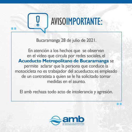 El Acueducto Metropolitano de Bucaramanga pidió tomar medidas frente a este hecho de intolerancia al contratista para el cual trabaja el hombre que conducía la motocicleta.