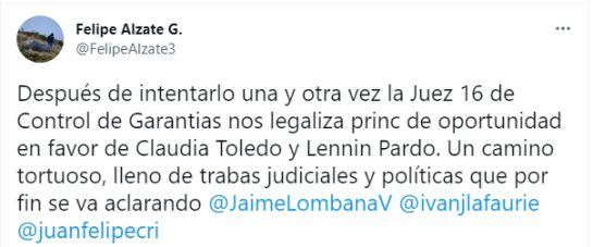 Caracol Radio conoció que el principio de oportunidad también cobija a Lennin Pardo, esposo de Pardo. Felipe Alzate, abogado suplente en la defensa de la pareja señaló que "fue un camino tortuoso, lleno de trabas judiciales y políticas que por fin se va aclarando".