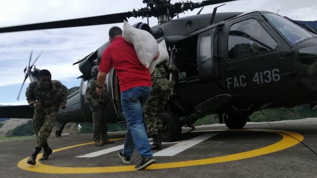 Los helicópteros UH-60, Black Hawk de la Fuerza Aérea Colombiana siguen transportando ayudas para las cerca de cuatro mil víctimas del desplazamiento forzado y damnificados por las lluvias, que están alojados en diferentes albergues del municipio de Ituango.