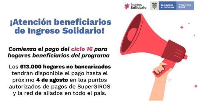 La Secretaría de Desarrollo Social de la Alcaldía de Manizales, dieron a conocer que, el pago 16 de Ingreso Solidario estará disponible hasta el miércoles 4 de agosto para los 12.390 beneficiarios de la capital de Caldas en las modalidades bancarizada y giro, los mismos recibirán los 160 mil pesos de la nómina.