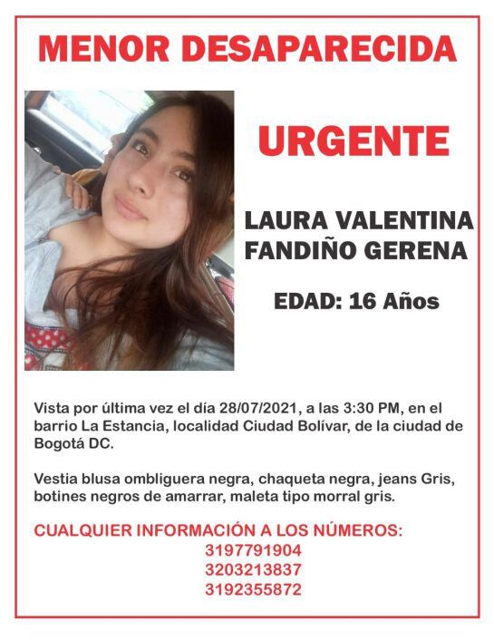 Laura Valentina Fandiño desapareció en el barrio La Estancia, en la localidad de Ciudad Bolívar en la ciudad de Bogotá.
