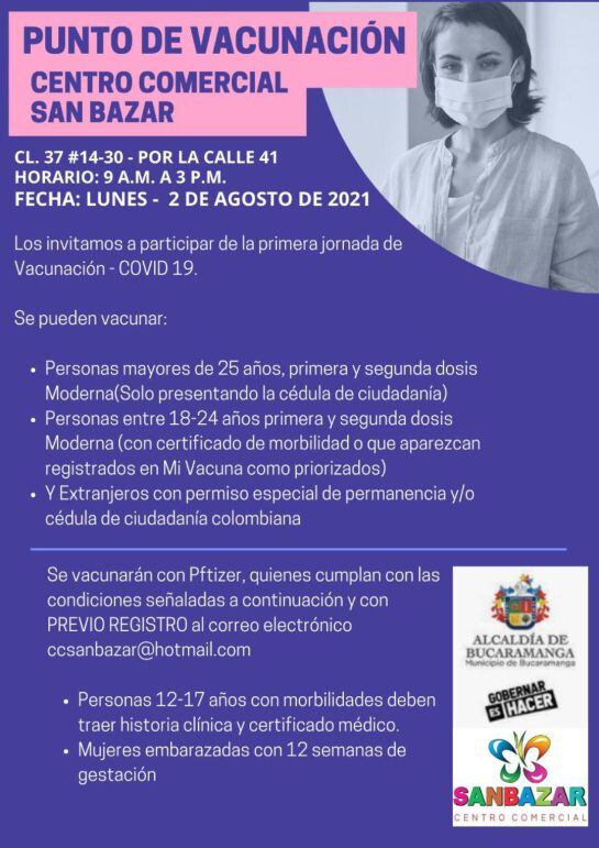 Instalaron un puesto en la calle 37 # 14- 30 (por la calle41) para recibir a quienes estén autorizados por el Gobierno Nacional. El equipo vacunador estará desde las 9:30 a. m. hasta las 3:00 p.m.