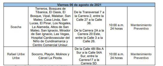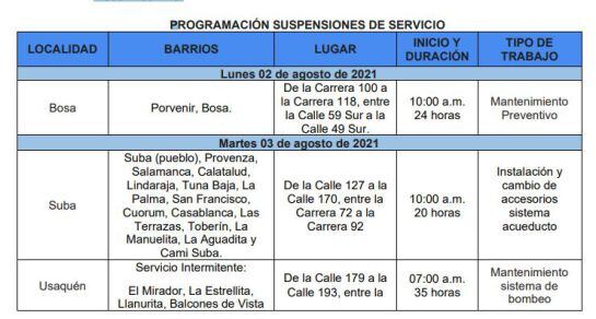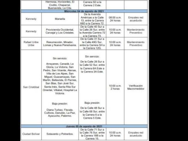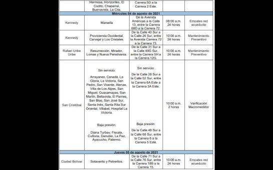 La empresa de Acueducto y Alcantarillado de Bogotá informó que ente el 2 y 6 de agosto se realizarán obras de reparación y mantenimiento en las redes de distribución, en algunos sectores de la ciudad.