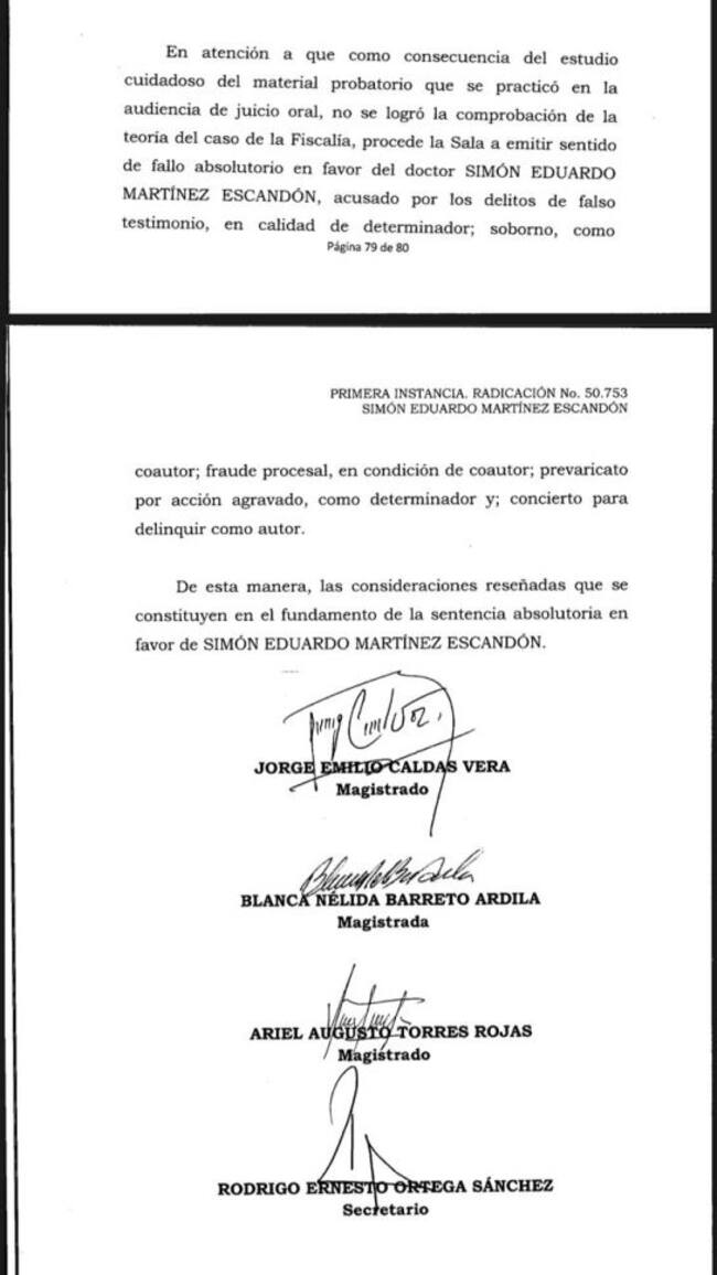 Así las cosas, fundada en las pruebas debatidas en el juicio oral, en el estudio cuidadoso del material probatorio que se practicó, la Corte fundamentó su sentencia absolutoria a favor de Martínez, pues no se logró la comprobación de la teoría del caso de la Fiscalía, “la Sala anuncia el sentido del fallo absolutorio en contra de Simón Eduardo Martínez Escandón, en relación con los punibles de Falso testimonio en calidad de determinador, soborno en calidad de coautor, fraude procesal en calidad de coautor, prevaricado por acción agravado, en calidad de determinador, y concierto para delinquir como autor (…)”, concluye el sentido del fallo, cuya lectura se desarrollará la próxima semana.