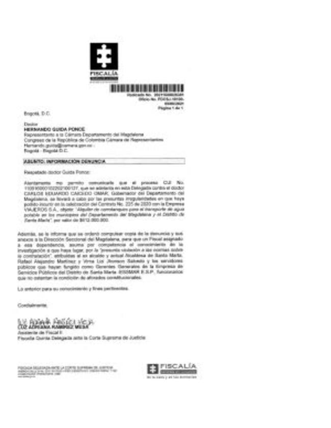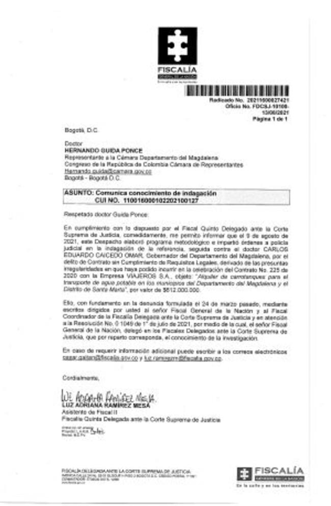 Así mismo, el Fiscal Quinto Delegado ante la Corte Suprema, el pasado 9 de agosto de 2021, impartió órdenes a la Policía Judicial en la indagación contra el gobernador del Magdalena, Carlos Caicedo, por el presunto delito de contrato sin cumplimiento de requisitos legales, derivado de las supuestas irregularidades en que haya podido incurrir en la celebración de contrato N° 225 de 2020 con la empresa Viajeros S.A., por objeto "alquiler de carrotanques para el transporte de agua potable en los municipios del departamento del Magdalena y el Distrito de Santa Marta", por el valor de $612.000.000.
