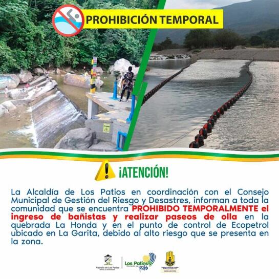 En un comunicado se ha especificado que “la alcaldía de Los Patios en coordinación con el Consejo municipal de gestión de riesgo y desastres, informan a toda la comunidad que se encuentra prohibido temporalmente el ingreso de bañistas y realizar paseo de olla en la quebrada La Honda y en el punto de control de Ecopetrol ubicado en la Garita, debido al alto riesgo que se presenta en la zona”.