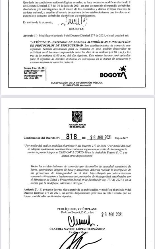 “A partir de mañana viernes 27 de agosto, los establecimientos comerciales que vendan bebidas alcohólicas podrán funcionar hasta las 3:00 am", señaló la alcaldesa Claudia López.