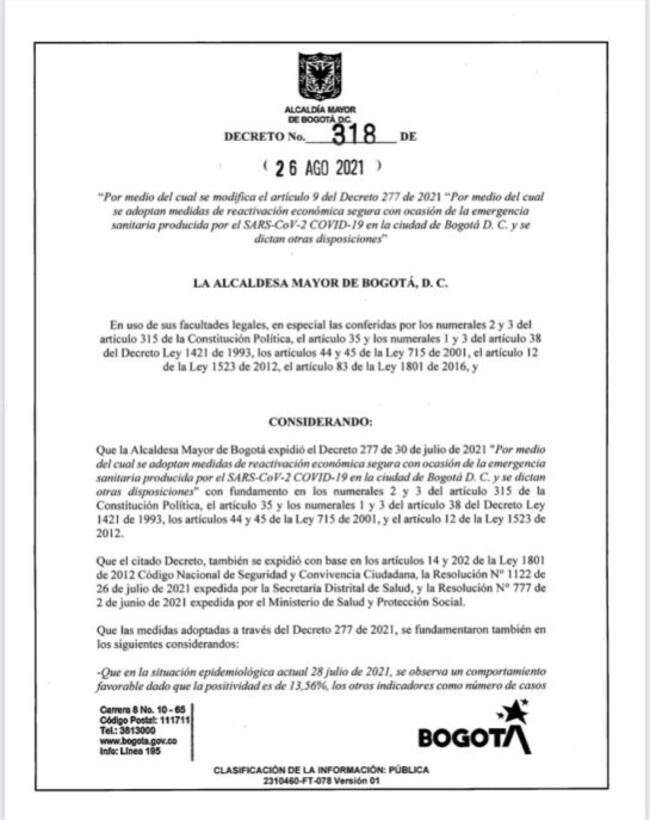 El decreto fue firmado por la alcaldesa Claudia López y es efectivo desde el viernes 27 de agosto.