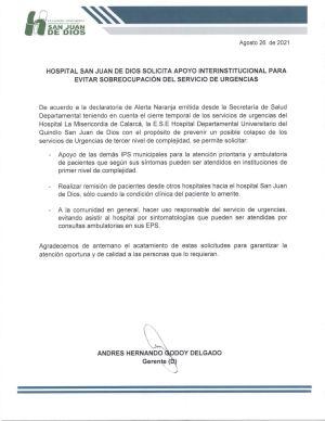 Debido al cierre temporal del servicio de urgencias en el hospital La Misericordia de Calarcá, Quindío y que el hospital del corregimiento de Barcelona también está cerrado, las directivas del hospital San Juan de Dios de Armenia hizo un llamado a las autoridades y establecer plan de contingencia.