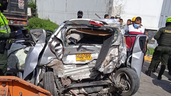El vehículo particular fue totalmente destruido por el impacto, quedando sus ocupantes atrapados entre las latas retorcidas, pero con vida.