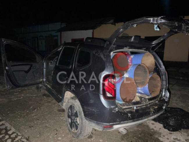 Después de repeler la acción y lograr llegar al vehículo una camioneta Duster Negra las autoridades halaron cilindros con explosivos y varias ramplas acondicionadas y mimetizadas para el ataque que planeaba la organización insurgente responsable del hecho.