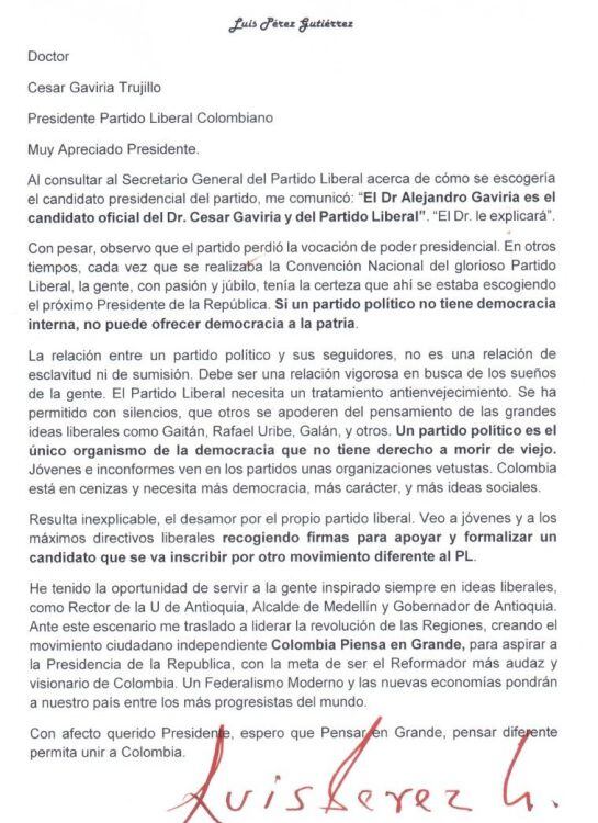 El ahora candidato presidencial y exgobernador de Antioquia, Luis Pérez, le envió una carta al presidente del Partido Liberal, César Gaviria manifestando su desacuerdo tras una consulta que le hizo al secretario general del partido sobre cómo se escogerá el candidato presidencial para las elecciones del 2022