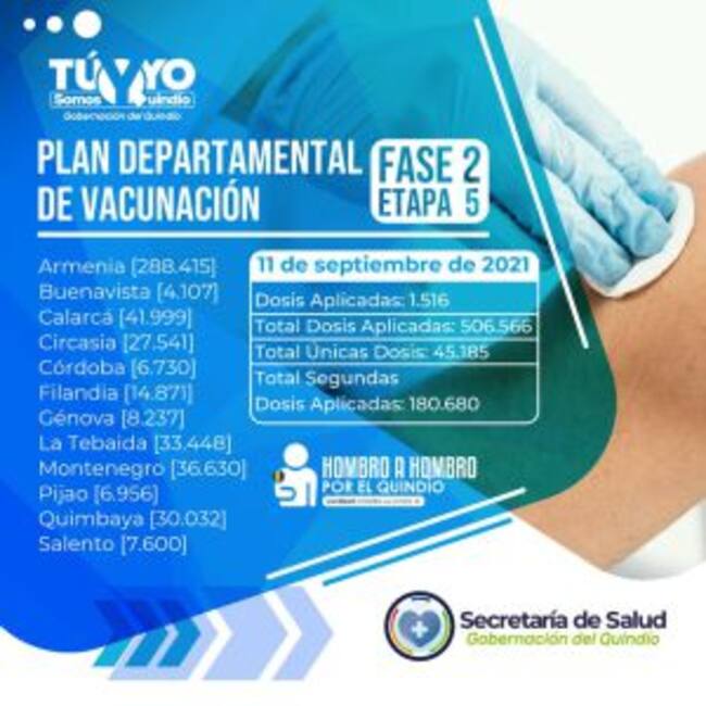 Según el último reporte del ministerio de salud en total en los 12 municipios del departamento han aplicado 506.566 dosis en total, en segundas dosis 180.680 y únicas dosis 45.185.