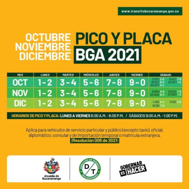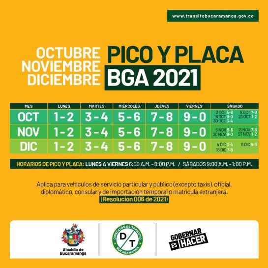 Para los sábados de octubre a diciembre de 2021, el pico y placa continuará la secuencia de los dígitos, de 9.00 de la mañana a 1:00 de la tarde iniciando el 2 de octubre con los dígitos 5 y 6.