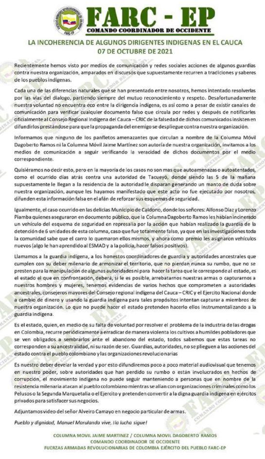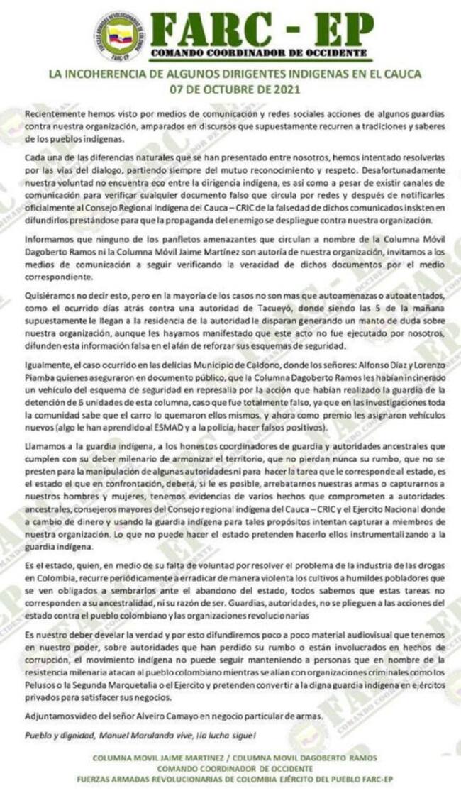 El escrito señala que ninguna de las recientes amenazas firmadas por las estructuras Jaime Martínez y Dagoberto Ramos es de su autoría, y menciona un reciente hecho contra una autoridad de Tacueyó, municipio de Toribío.