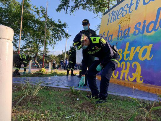 En el caballo de Bolívar estuvieron el general Samuel Darío Bernal, comandante de la Policía Metropolitana de Bucaramanga y la secretaria del Interior de esta capital, Melissa Franco. Anunciaron actividades específicas para devolver la tranquilidad a este punto donde se produjeron acciones violentas durante las protestas sociales en contra de la reforma tributaria.