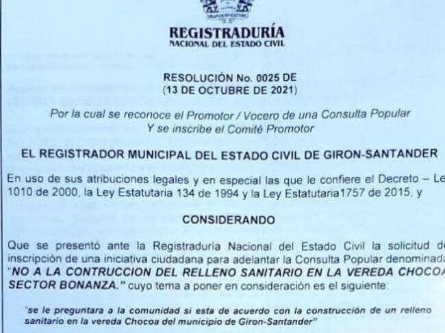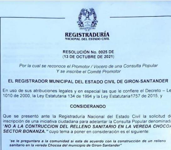 La Registraduría Nacional dio el aval al Comité por la Defensa de Chocoa de iniciar la recolección de firmas para llevar a cabo una consulta popular que defina por medio del voto si se construye o no el relleno sanitario en la vereda Chocoa en Girón.