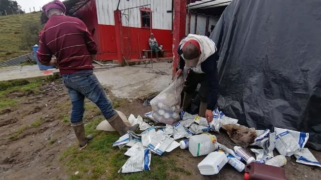 En la vereda La Cristalina se recogieron 405 kilos de envases, 44 galones de 5 litros y 6 fumigadoras para desechos; entre tanto en el corregimiento Colombia fueron recuperados 40 kilos de envases y otros 32 de bolsas.